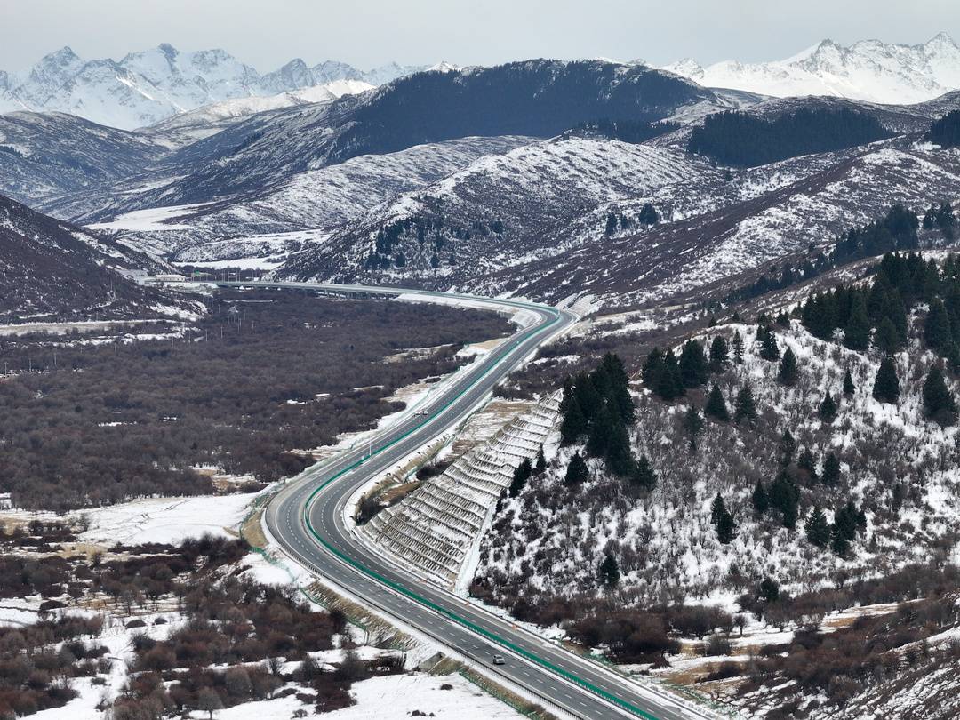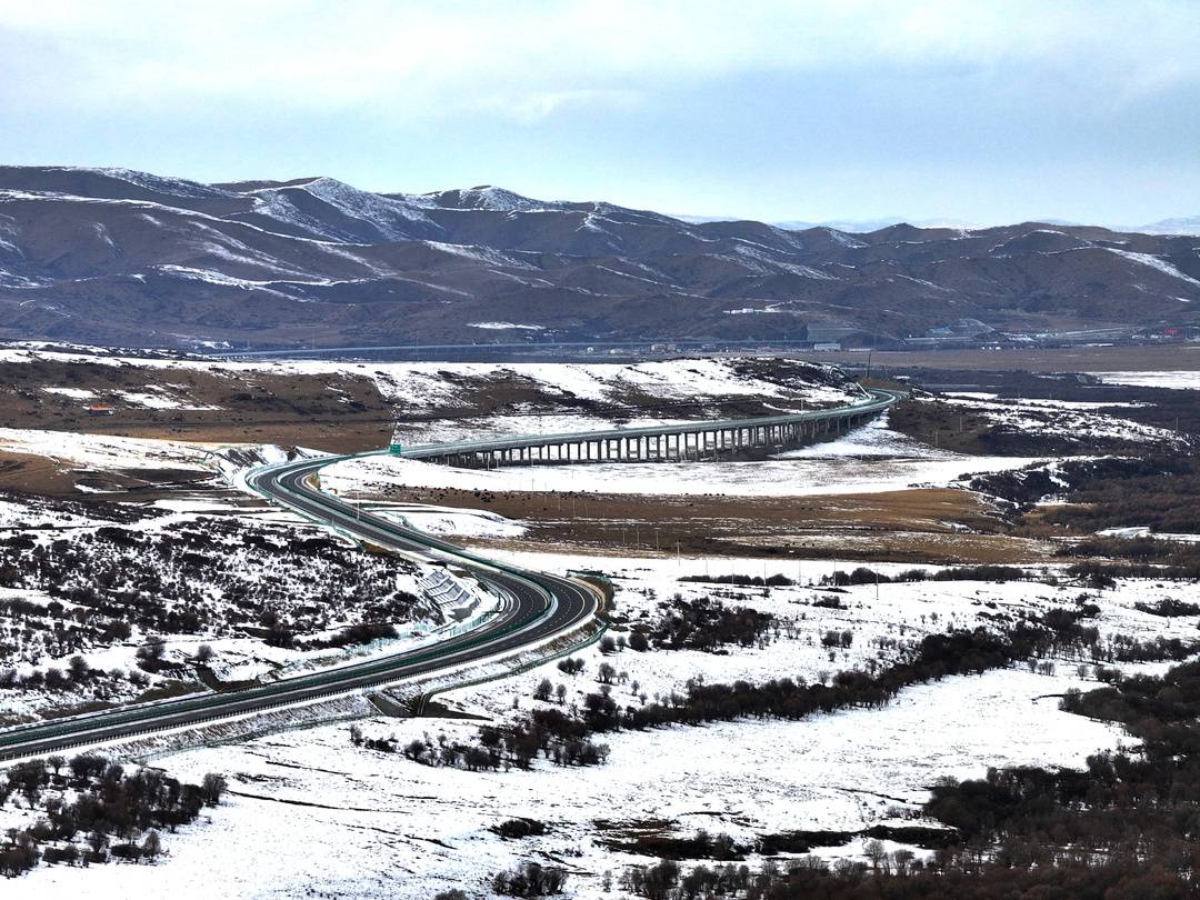 12月上旬,记者从中壤口收费站出发,乘车一路向西北行进,试跑此次通车段。随着海拔不断攀升,气温越来越低,风力也变得更猛,公路两侧的风景从枯黄草原变成皑皑白雪。川西高原上,久马高速如同一条丝带布展其间。