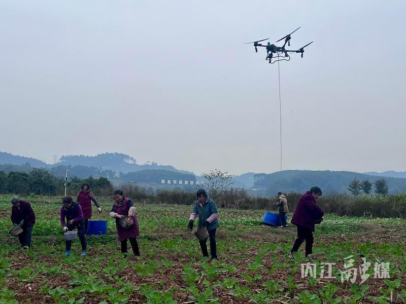 田野之上,一架无人机低空掠过池塘,将一桶桶复合肥精准投送至田间。13位村民分工协作,接应、播撒,为油菜追施越冬肥料。