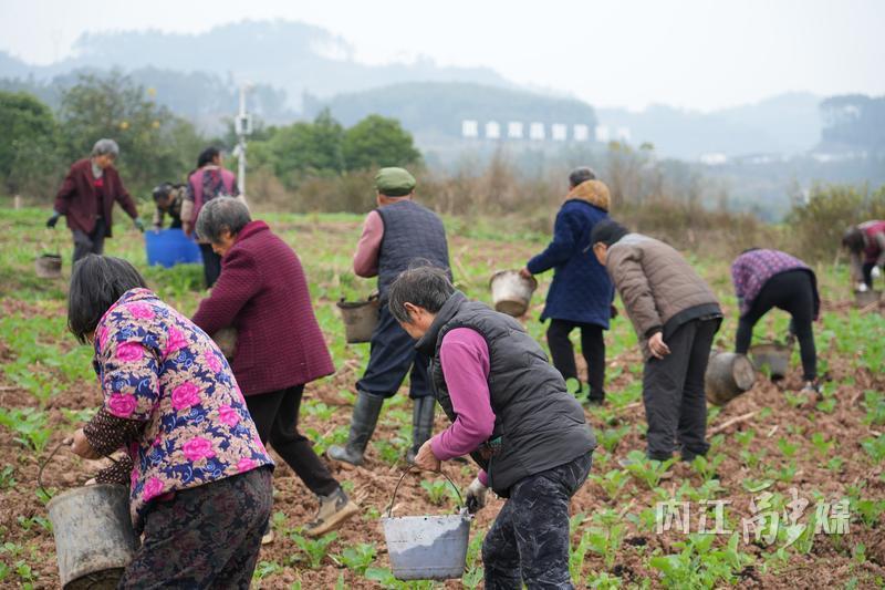 正在田间劳作的朱祖先和村民们一道,把黑色的复合肥料精准地撒在油菜根部。75岁的她身体硬朗,干起活来不输比她年轻十几岁的村民。