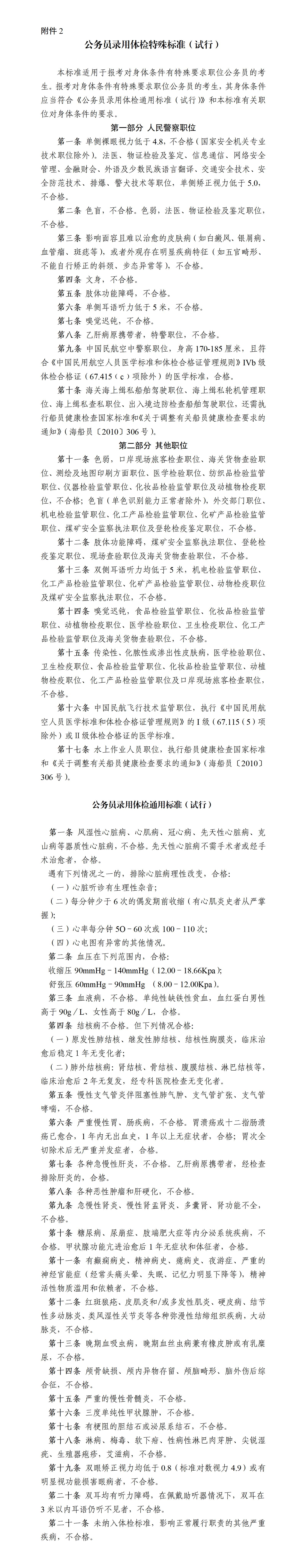 2.《公务员录用体检特殊标准(试行)》《公务员录用体检通用标准(试行)》