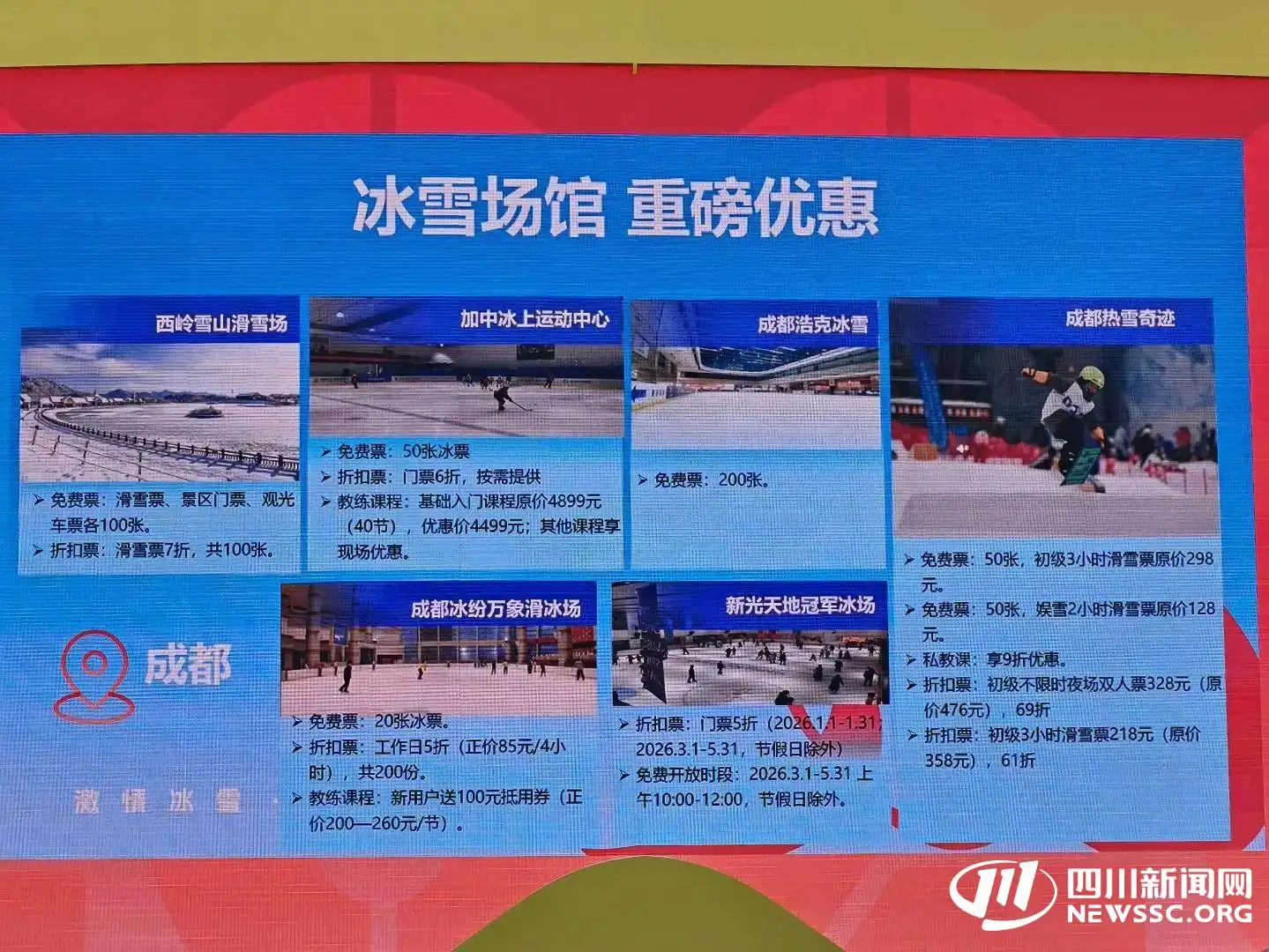 全省多家冰雪场馆推出重磅福利——成都热雪奇迹提供免费初级滑雪票、夜场双人折扣票及私教课9折优惠等;西岭雪山滑雪场提供免费滑雪票、景区门票、观光车票等;阿坝州孟屯河谷滑雪场为理县中小学生提供免费滑雪及教练教学等;九寨穹恰冰雪大世界推出8折滑雪票与9折春节滑雪票等;成都加中冰上运动中心、成都浩克冰雪冰场、宜宾飞跃冰上运动中心、达州罗盘顶滑雪场、阿坝州九鼎山太子岭滑雪场等也同步推出免费票、折扣票及家庭套票等多元选择;雅安王岗坪滑雪场推出针对成人、儿童的优惠滑雪票;成都冰纷万象滑冰场、新光天地冠军冰场则推出工作日5折、免费开放时段、课程抵用券等福利。