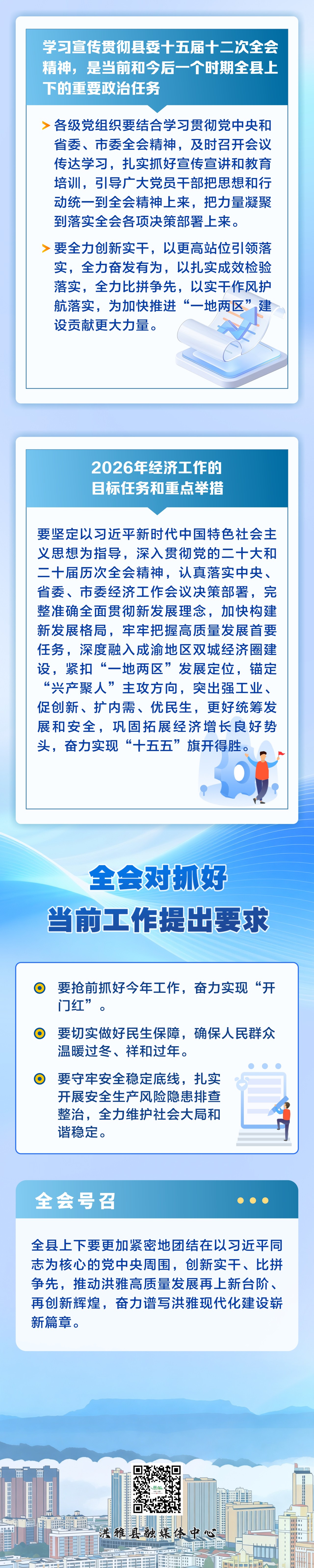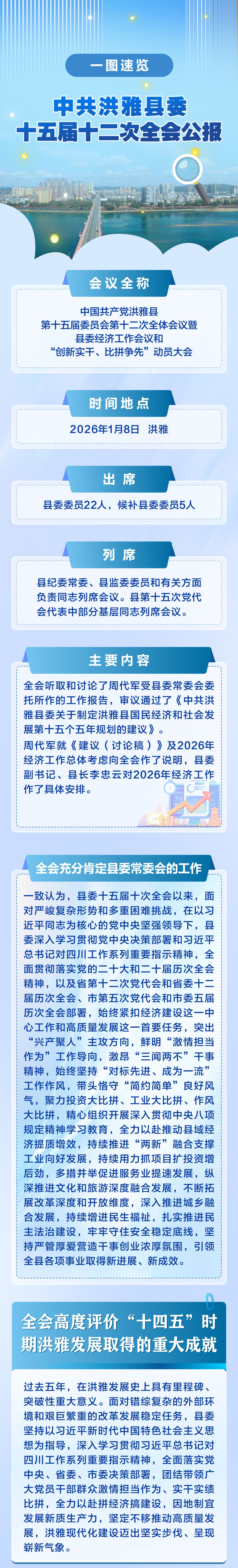 一图速览 | 中共洪雅县委十五届十二次全会公报 洪雅融媒 2026-01-08 18:23 7868 1月8日,中国共产党洪雅县第十五届委员会第十二次全体会议暨县委经济工作会议和“创新实干、比拼争先”动员大会举行。全会听取和讨论了周代军受县委常委会委托所作的工作报告,审议通过了《中共洪雅县委关于制定洪雅县国民经济和社会发展第十五个五年规划的建议》。周代军就《建议(讨论稿)》及2026年经济工作总体考虑向全会作了说明,县委副书记、县长李忠云对2026年经济工作作了具体安排。“十五五”时期洪雅经济社会发展的主要目标是啥?如何实现这些目标?一图速览↓↓↓制图:周宇琴 打开微信“扫一扫”,打开网页后点击屏幕右上角分享按钮 评论 0 还没有添加任何评论,快去APP中抢沙发吧! 我要评论