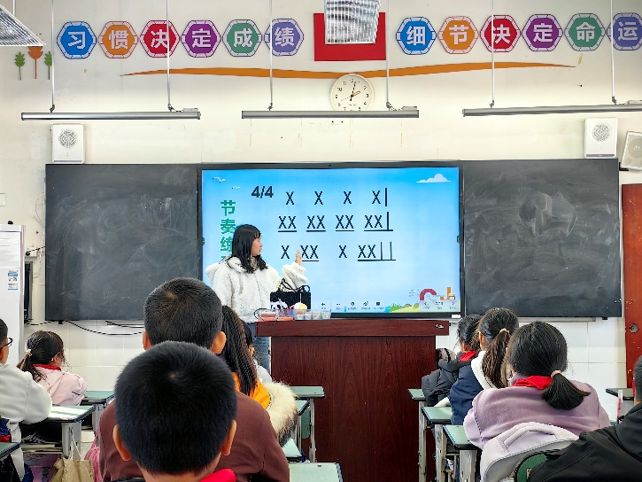 在音乐教师潘虹洁的课堂上,孩子们使用矿泉水瓶装上豆子制作成的沙锤,用易拉罐制作成的响板作为演奏乐器,整个课堂迸发出欢快的节奏,跃动着音乐的活力。
