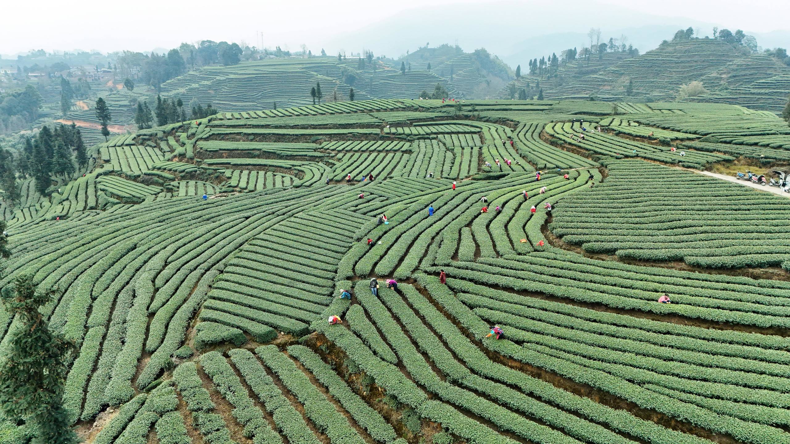 在止戈镇青杠坪村万亩生态茶园里,层层叠叠的茶树随山势铺展,茶农们也正抢抓晴好天气,忙着采摘、鲜叶转运,茶园与村落相映成趣,尽显生态茶乡魅力。