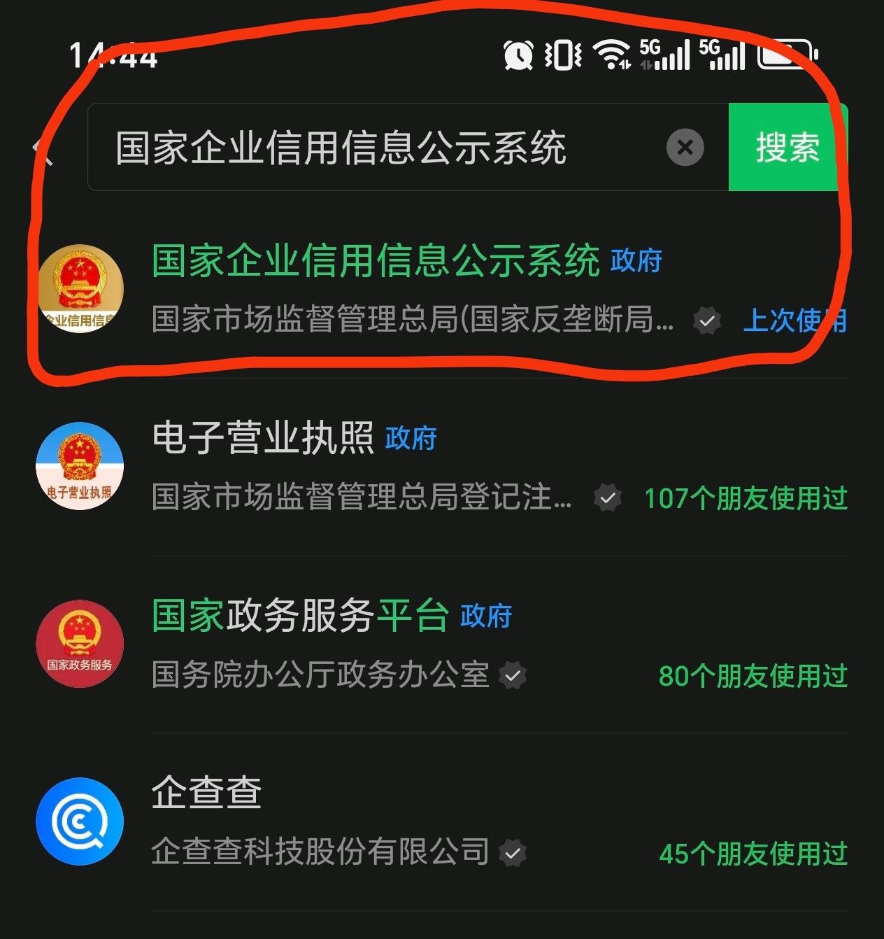 1.打开“微信”,搜索小程序“国家企业信用信息公示系统”,点击进入。