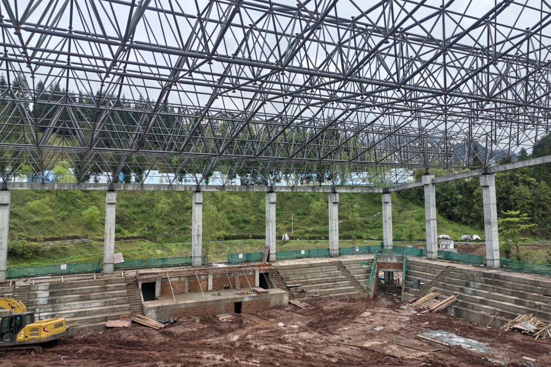 与此同时,主场馆主体结构也已完成,看台初具雏形,工人们正在进行配套设施施工。